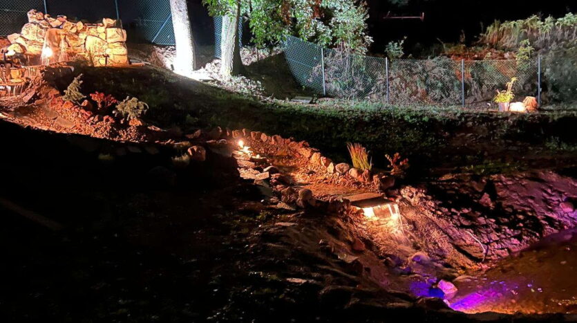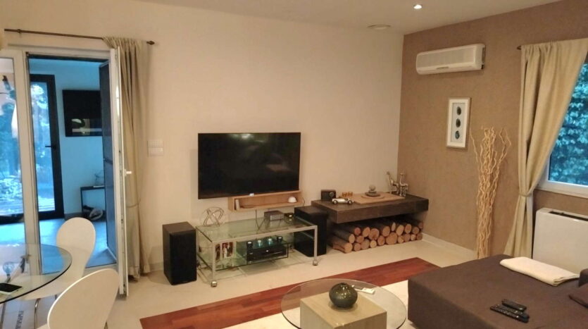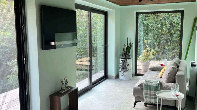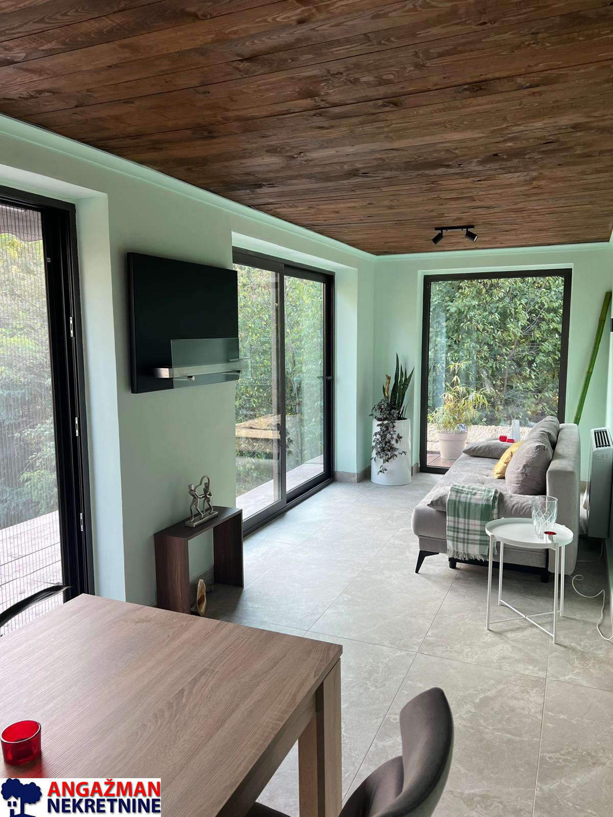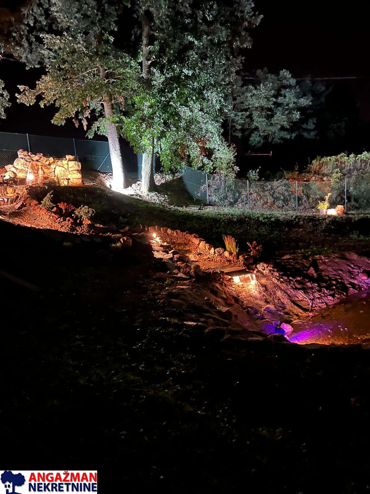 Moderan enterijer sa velikim staklenim površinama koje donose obilje prirodnog svetla i pružaju prekrasan pogled na šumu i okolinu. Obilje dvorišne rasvete.