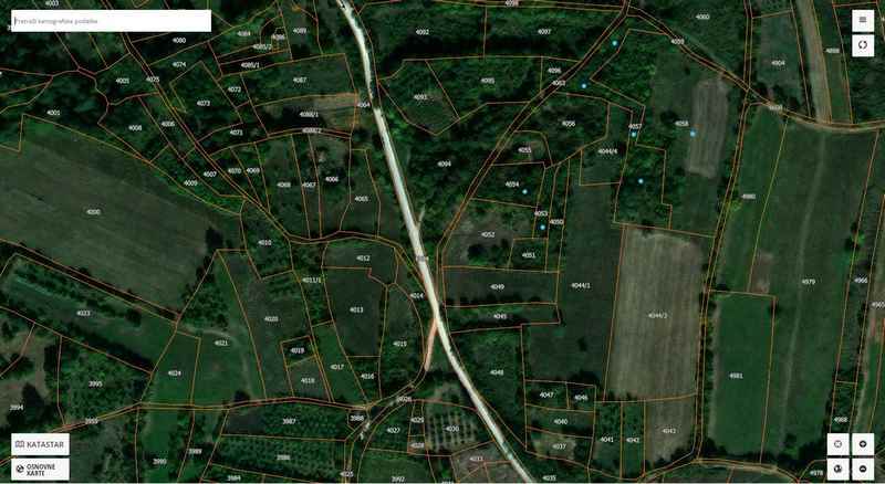 Postoji mogućnost da se kupe i dve veće parcele iza ove dve označene plavim tačkicama na geokarti (2893+7307=1ha 2a).