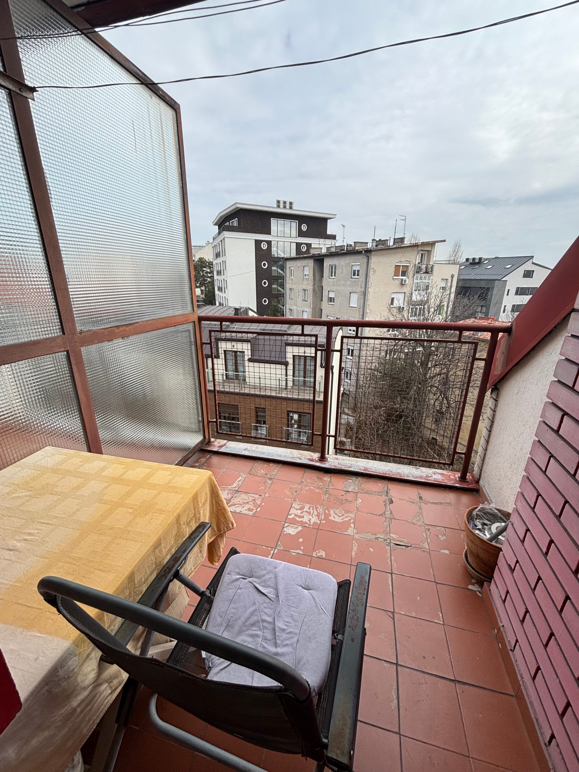 Vojna zgrada kvalitetne gradnje od fasadne cigle. Stan je okrenut ka mirnom delu ulice, tako da je ušuškan i tih. Prostorije: hodnik, dnevna soba sa trpezarijom, kuhinja, tri spavaće sobe, kupatilo, toalet i 4 terase.